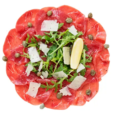 Carpaccio er klassískur ítalskur réttur sem hentar bæði sem létt máltíð eða sem glæsilegur forréttur. Iðulega framreiddur með ólífuolíu, sítrónusafa, parmesanosti, capers og ferskum kryddjurtum. Einnig er vinsælt að bera fram carpaccio með truffluolíu og klettasalati. Þetta Carpaccio er úr 100% nautakjöti af hollenskum uppruna. Sölueiningin er 1 askja sem inniheldur 10 x 80 gramma skammta sem hverjum um sig er raðað í hring á smjörpappír svo það er leikur einn að færa yfir á disk og bera fram.